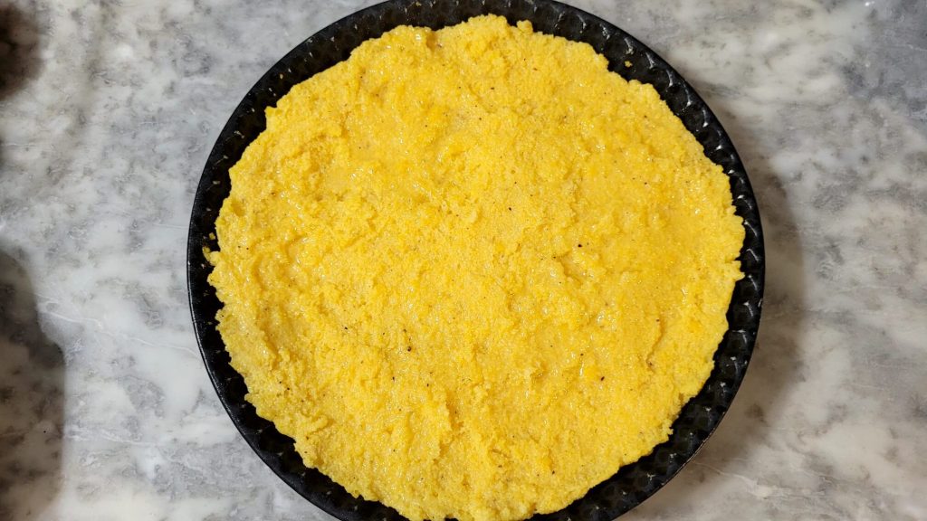 Transférez la polenta chaude dans un moule à tarte légèrement huilé et vaporisez la surface avec un peu d’huile