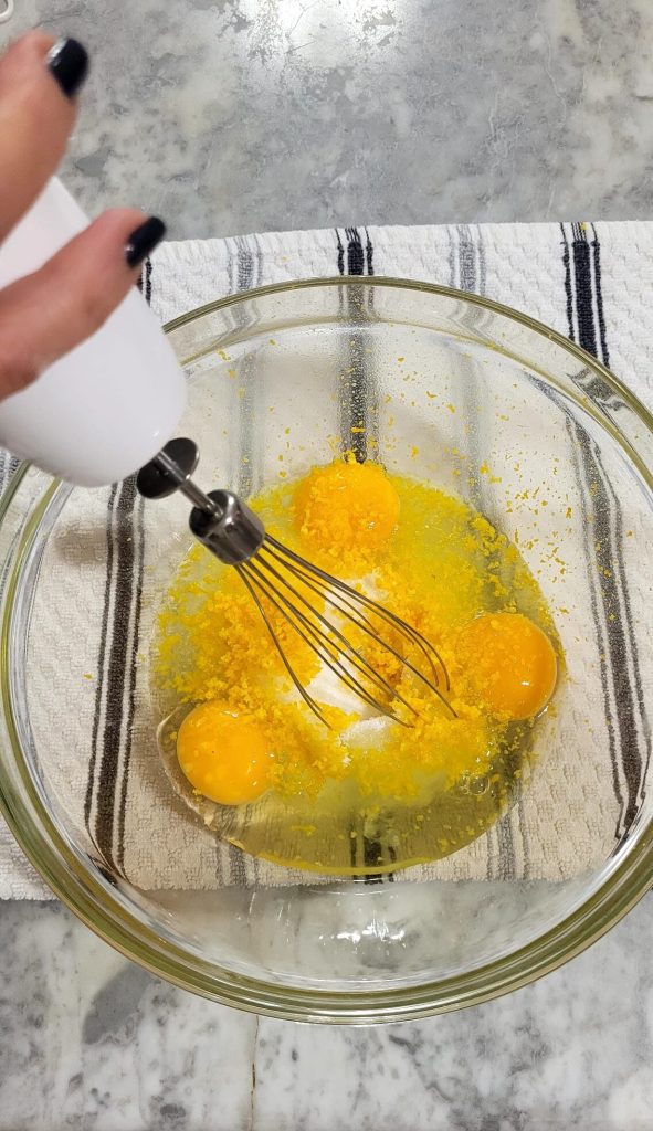 Pendant que le chocolat refroidit, montez les œufs avec le sucre, le zeste d’orange râpé et une pincée de sel. Vous devez obtenir un mélange clair et mousseux