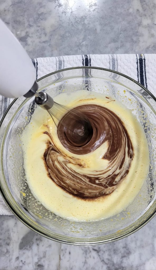 Maintenant, incorporez la farine et le cacao tamisés. Toujours avec le fouet, remuez jusqu’à obtenir une pâte lisse