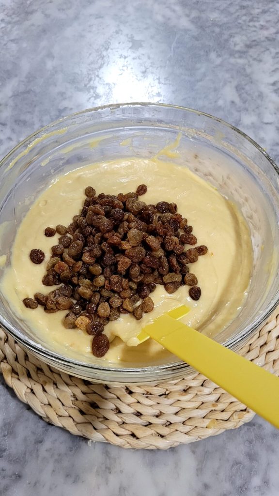 Rappelez-vous de faire ramollir les raisins secs avant de commencer à préparer le gâteau, j’ai aussi ajouté quelques gouttes d’arôme d’orange pour un goût plus agrumé.