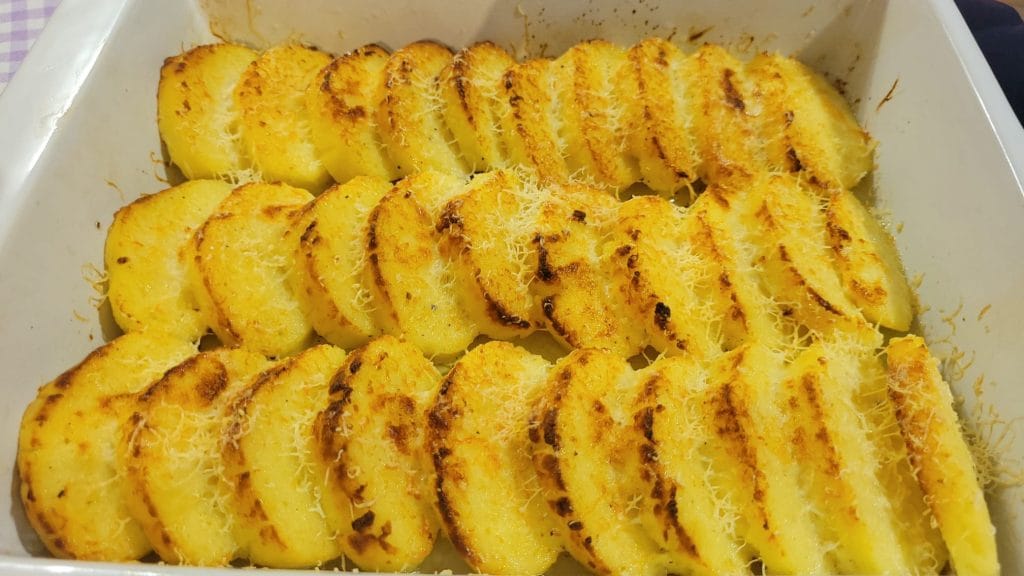 • Après le repos, découpez des disques d’environ 1/1,5 cm et placez-les dans un plat (je les ai divisés en deux) beurré, légèrement superposés, saupoudrez-les de beurre fondu, de pecorino et du reste de beurre en dés