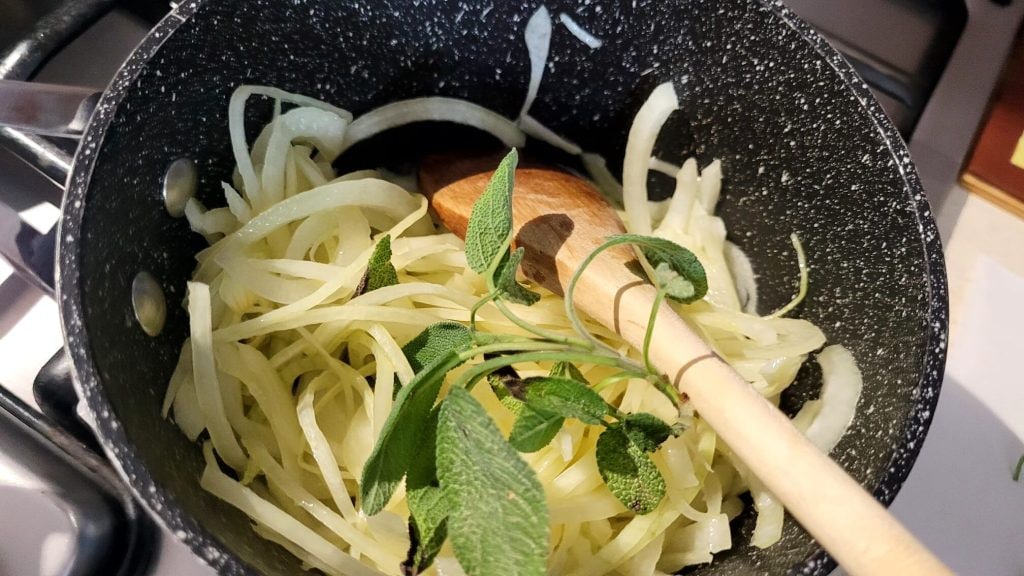 • En attendant que les œufs refroidissent, épluchez et tranchez l’oignon et faites-le fondre dans une petite poêle avec un filet d’huile et la sauge, salez à votre convenance