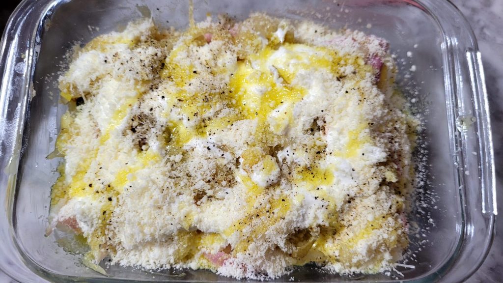 Pour le Gratin d’Oeufs à la Friteuse à Air, j’ai également cuit les œufs à la friteuse à air, mais si vous préférez, utilisez la méthode traditionnelle. J’ai enrichi ces œufs avec un oignon aromatisé à la sauge, du jambon cuit fumé, de la crème de cuisine et du parmesan.