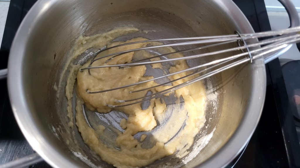 Ajoutez le lait petit à petit jusqu’à ce que la béchamel s’épaississe. Assaisonnez de sel et ajoutez une pincée de poivre et de noix de muscade.