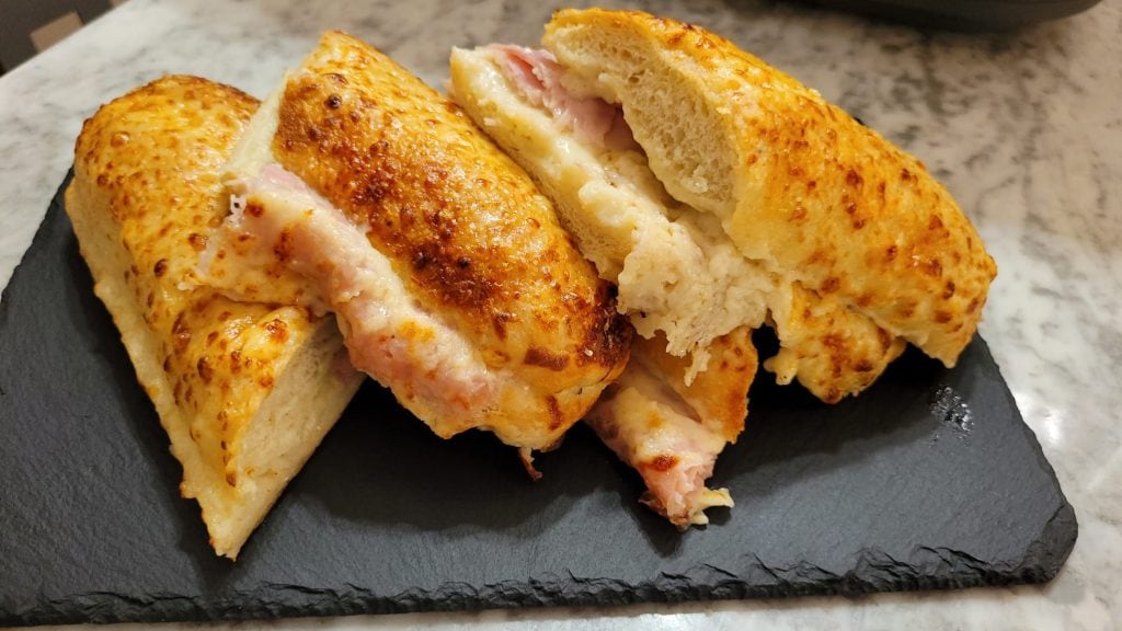 La Croque Monsieur est une recette typique du street food français. La première fois que je l’ai préparé, j’avais du pain de la veille et comme cela m’intriguait beaucoup, j’ai essayé de le faire, mais j’ai remplacé un ingrédient… La recette française prévoit l’utilisation du fromage Comté que je n’avais pas, donc j’ai utilisé notre fromage Grana Padano râpé et bien, j’espère que les Français ne m’en voudront pas mais j’ai mis un peu d’Italie dans leur sandwich.