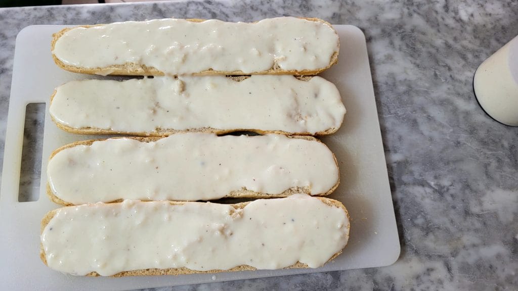 J’ai utilisé 2 petites baguettes précuites, mais on peut les remplacer par du pain blanc ou même du pain de la veille, comme un pain de campagne.