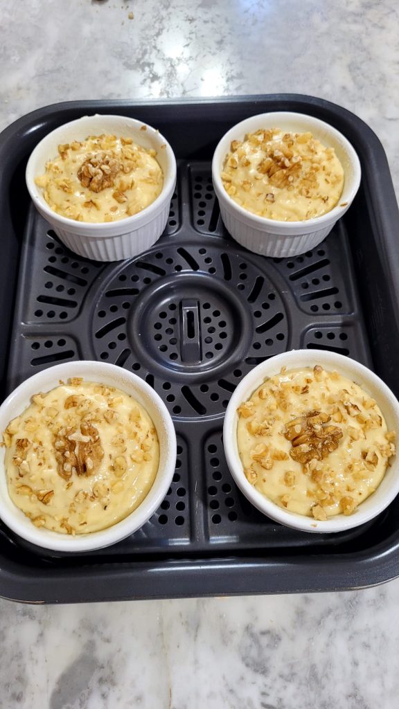 Ajoutez à la surface de chaque muffin, un cerneau de noix entier et un autre grossièrement écrasé. Placez les moules sur la grille ou le plateau de votre friteuse