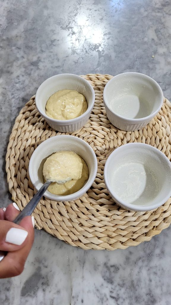 Beurrez et farinez les moules et versez une partie du mélange en vous aidant d’une cuillère