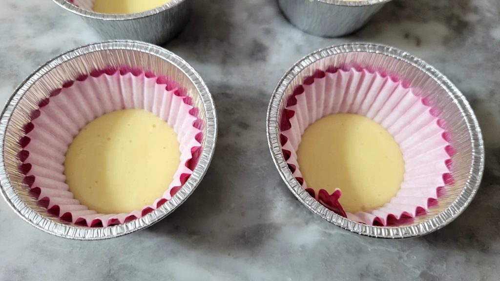 Placez les caissettes en papier dans celles en aluminium et versez la pâte blanche