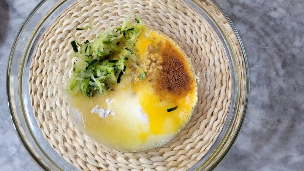 Dans un bol, mettez la farine et la levure tamisées, une pincée de sel, l’œuf légèrement battu, les éclats de noix, le sucre, la cannelle, les courgettes bien égouttées et enfin le beurre fondu.