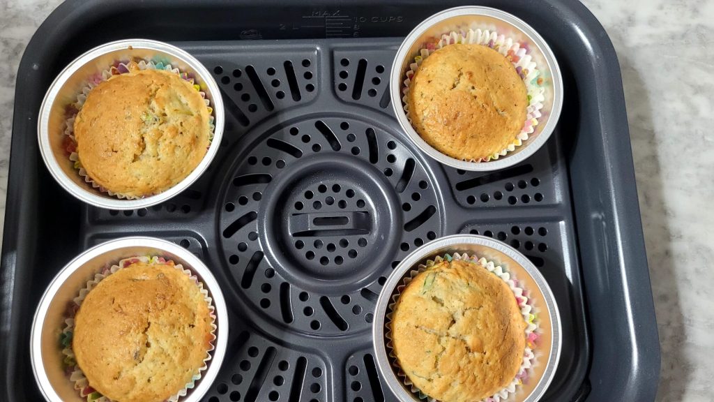 Ces muffins sucrés aux courgettes à la friteuse à air sont également rapides à préparer : il suffit de râper la courgette en julienne, de la presser pour l’égoutter de son eau et de la mélanger avec le reste des ingrédients dans un bol, y compris les noix et la cannelle qui ajoutent cette touche en plus. J’espère que cette recette vous plaira autant qu’à moi !