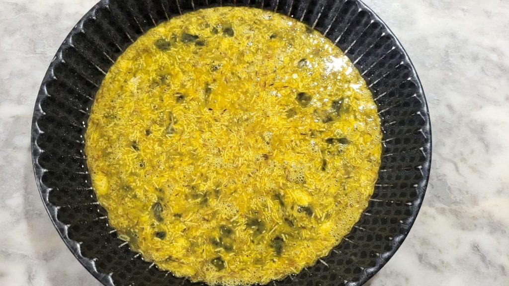 Après avoir battu les œufs avec les autres ingrédients, versez le mélange d’un des deux bols dans un moule légèrement huilé et vaporisez la surface avec un peu d’huile