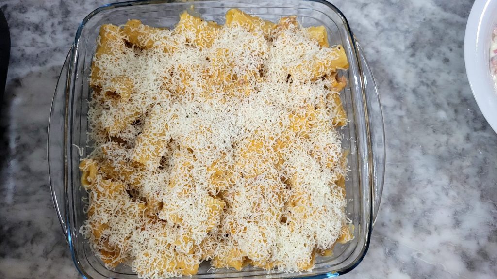 • Pendant ce temps, faites chauffer l’eau dans une marmite et préparez les pâtes. Égouttez-les quelques minutes avant les temps indiqués sur l’emballage, sinon elles seront trop cuites après la seconde cuisson à la friteuse à air. Ajoutez dans la marmite l’assaisonnement de courge et saucisse et le grana râpé et mélangez (gardez-en un peu de côté pour saupoudrer la surface des pâtes pour le gratinage)