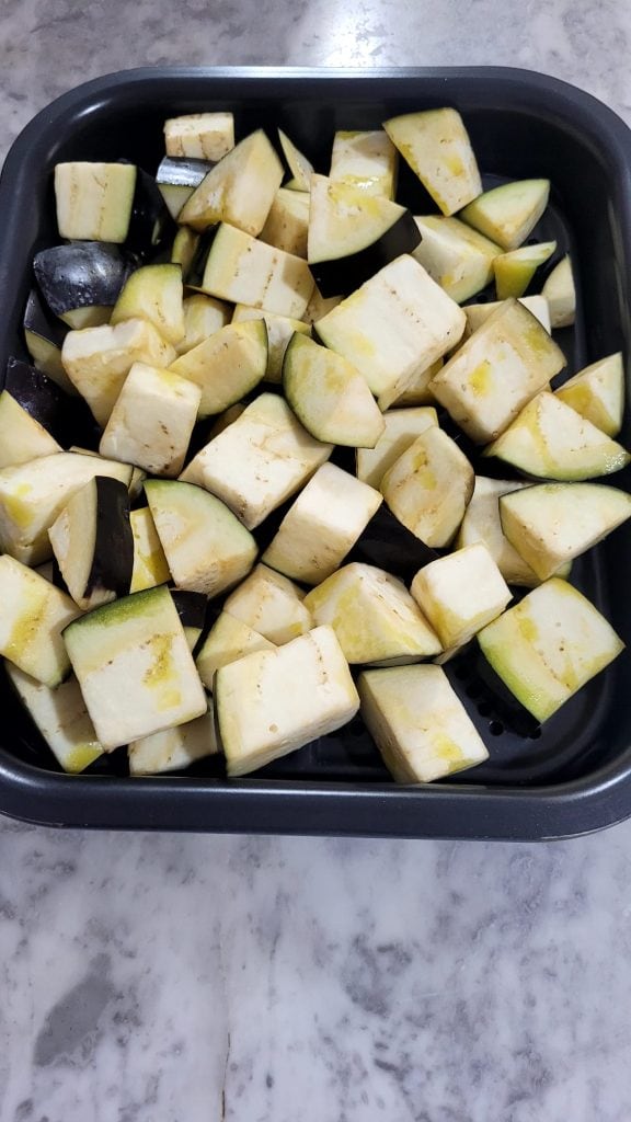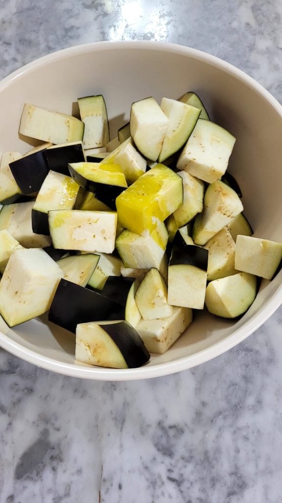 Commencez par les aubergines : après les avoir lavées et séchées, retirez les deux extrémités et coupez-les en morceaux pas trop petits. Transférez le tout dans un grand bol, ajoutez l’huile et mélangez avec une cuillère