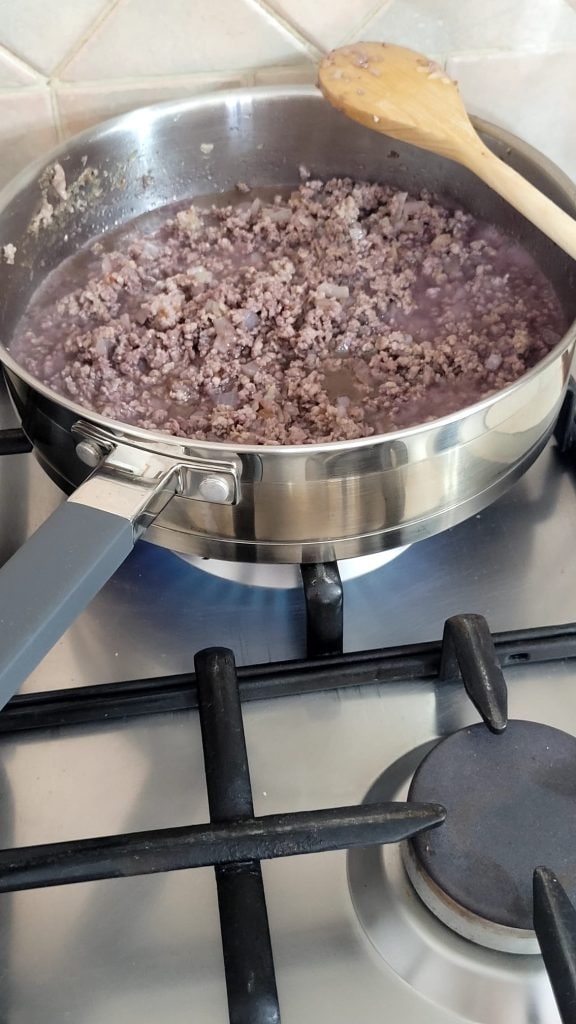 Quand l’oignon est mijoté, ajoutez la viande hachée et faites-la dorer à feu moyen en mélangeant