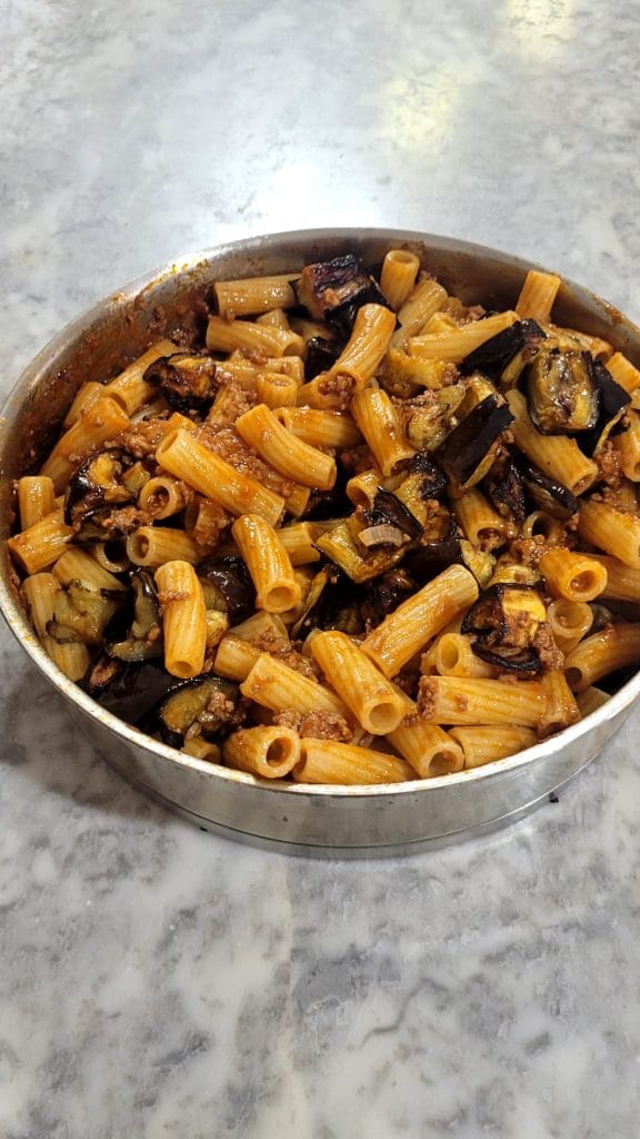 Les pâtes aux aubergines peuvent être préparées à l’avance ou en divisant les différentes préparations sur plusieurs jours. Moi, par exemple, je prépare le ragoût la veille et le lendemain les aubergines et j’assemble le tout avec les pâtes. Si vous n’avez pas la friteuse, vous pouvez faire frire les aubergines dans une poêle et cuire les pâtes au four, je vous laisse les instructions à la fin de la recette