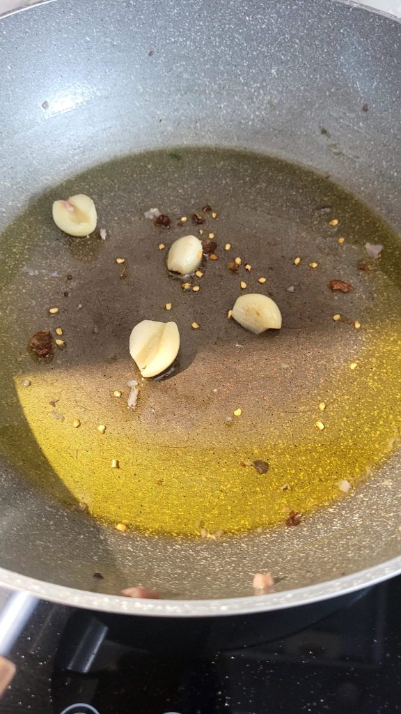 Utilisez la même poêle : nettoyez le fond avec une feuille d’essuie-tout pour enlever les résidus de liquide éventuellement présents, puis versez un filet d’huile d’olive extra vierge, ajoutez les gousses d’ail restantes (toujours privées de leur germe) et le piment émincé.