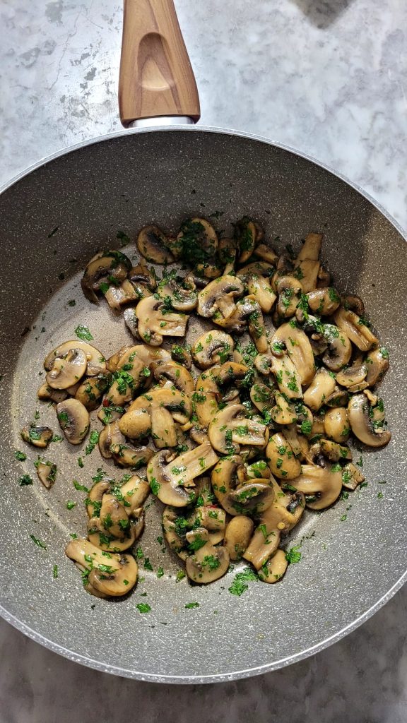 Faites cuire à feu modéré couvert pendant environ 8 minutes, en remuant de temps en temps. Ils vont libérer leur liquide végétal, à ce moment-là enlevez le couvercle et laissez cuire pendant encore 10 minutes jusqu’à ce qu’ils soient secs. Ajoutez le persil préalablement haché