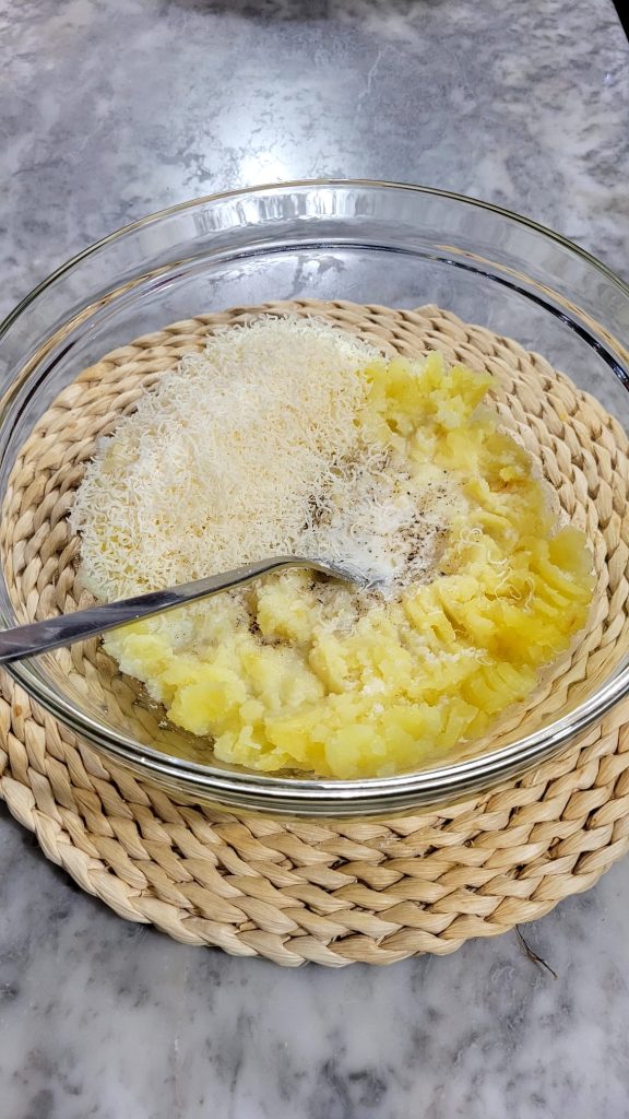 Mettez-les dans un bol et après les avoir écrasées avec une fourchette, ajoutez les ingrédients : parmesan râpé, sel, poivre et lait. Mélangez bien