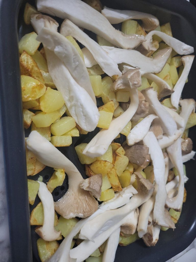 • Après avoir lavé et pelé les pommes de terre, les rincer sous l’eau courante, les sécher avec un essuie-tout, les couper en morceaux et les transférer dans un bol. Les assaisonner avec quelques pulvérisations d’huile et les gousses d’ail, mélanger et les passer directement sur la grille du tiroir de la friteuse à air ou sur le plateau perforé si vous avez une friteuse four. Cuire à 200°C pendant 15 minutes.