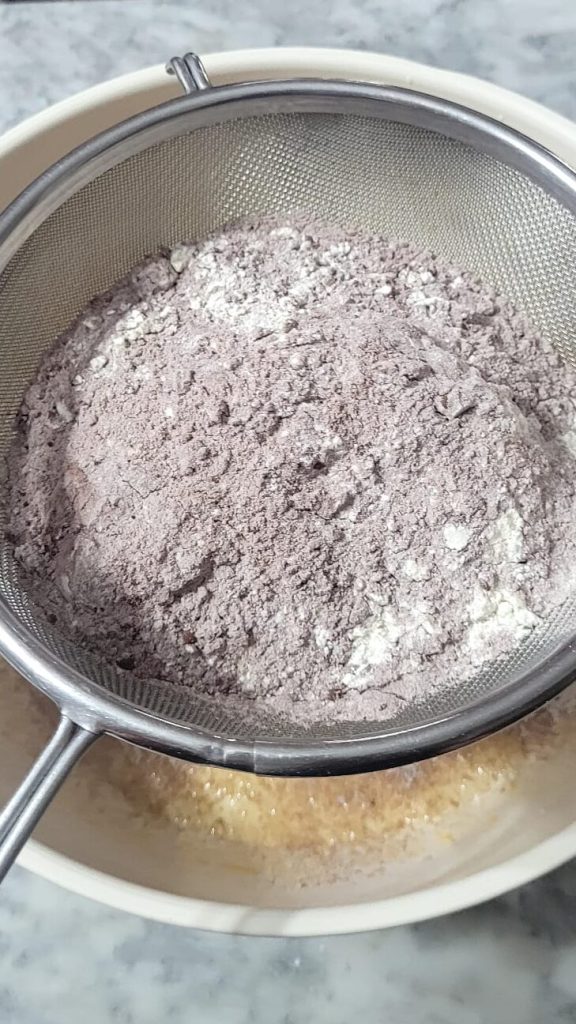 Dans un autre bol, mélangez la farine et le cacao puis incorporez-les tamisés au mélange d’œufs. Ajoutez une pincée de sel et continuez à fouetter jusqu’à obtenir une pâte lisse et sans grumeaux