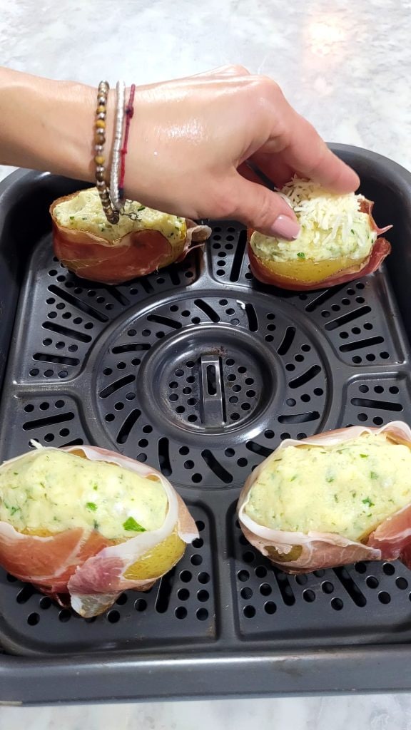 Les Pommes de Terre en Papillote Farcies à Friteuse à Air sont simples, rustiques, mais avec une touche de gourmandise qui conquiert dès la première bouchée. Faciles et rapides à préparer, elles m’ont sauvé le dîner! Idéales pour les journées froides ou quand je veux mettre sur la table quelque chose de bon avec très peu d’effort. Le croquant du speck qui enveloppe la pomme de terre et qui offre cette note croquante et fumée, la douceur de son intérieur, avec la crémeuse du gorgonzola et de l’asiago fondant créent un équilibre parfait entre saveurs et textures.