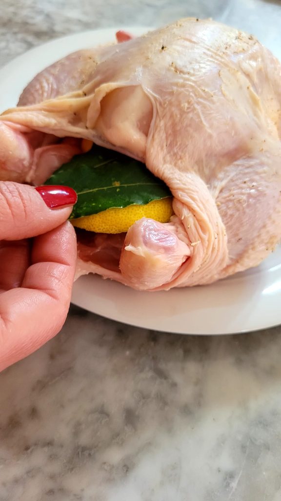 Prenez le poulet, (le mien était nettoyé à l’intérieur) brûlez et éliminez les éventuels résidus de plumes et de poils et insérez à l’intérieur les feuilles de laurier et deux tranches de citron