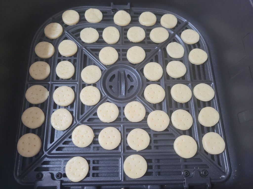 Placez-les directement sur la grille de votre friteuse, ou sur le plateau si vous avez une friteuse four, et faites-les cuire à 200°C pendant 10 minutes en mode air fry. Pendant que les Ritz cuisent, faites fondre le beurre salé.