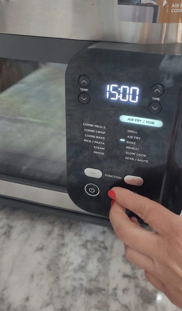 Insérez le moule dans la friteuse et cuisez avec le programme bake à 180° x 15 minutes. Ma friteuse effectue un préchauffage de deux minutes avec le programme bake.