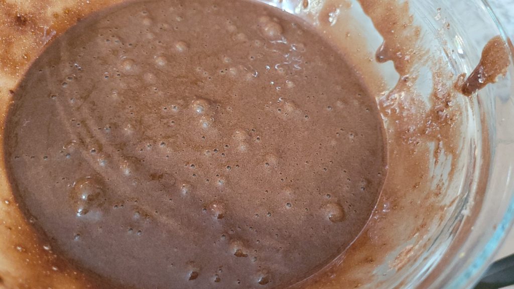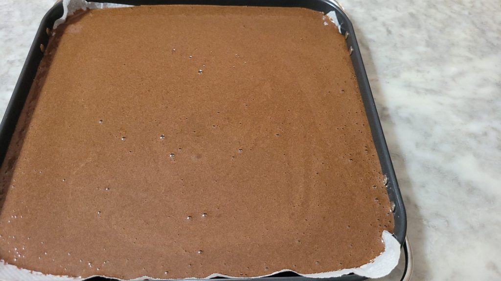 Tapisser un moule rectangulaire ou carré de papier cuisson et y verser le mélange en lissant bien.