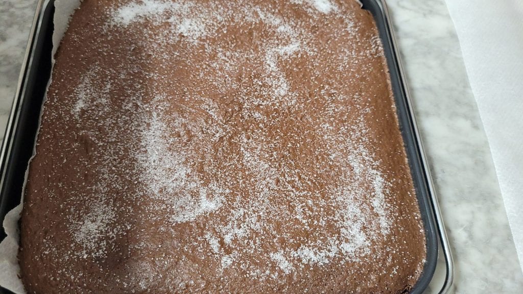 Une fois prêt, transférer la génoise sur un plan de travail, la saupoudrer de sucre en poudre, la retourner sur une autre feuille de papier cuisson et retirer le papier cuisson de la cuisson.