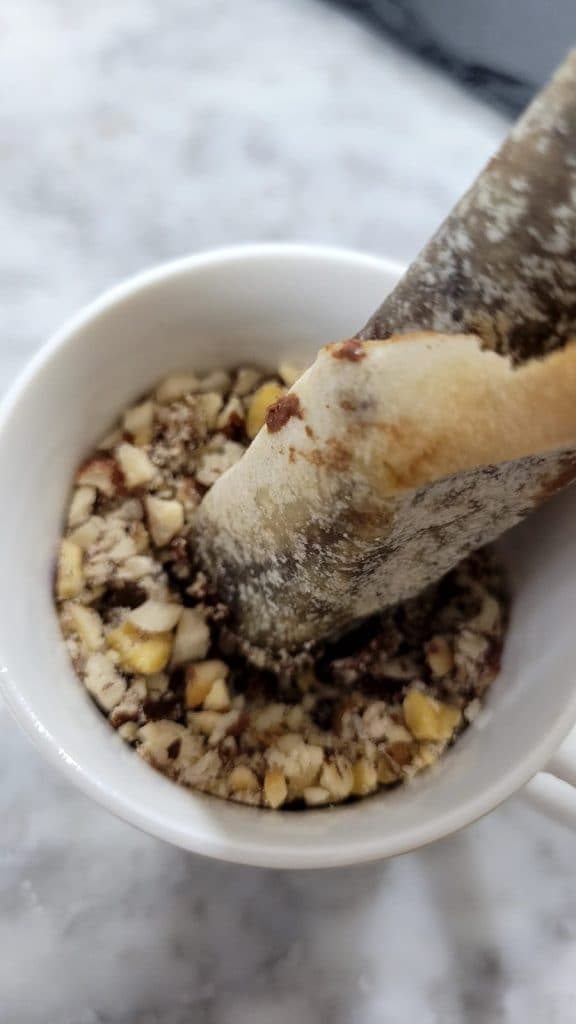 • Passer la partie coupée dans le praliné de noisettes, si elles n’adhèrent pas, vous pouvez ajouter une fine couche de Nutella sur l’extrémité et ensuite dans le praliné