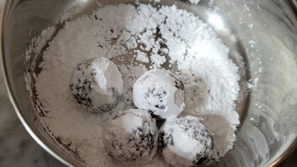 • Une fois le temps de repos terminé, séparez des petits morceaux de pâte et formez des boules un peu plus grosses qu’une noix. Versez du sucre glace dans un bol et roulez-les dedans pour les enrober