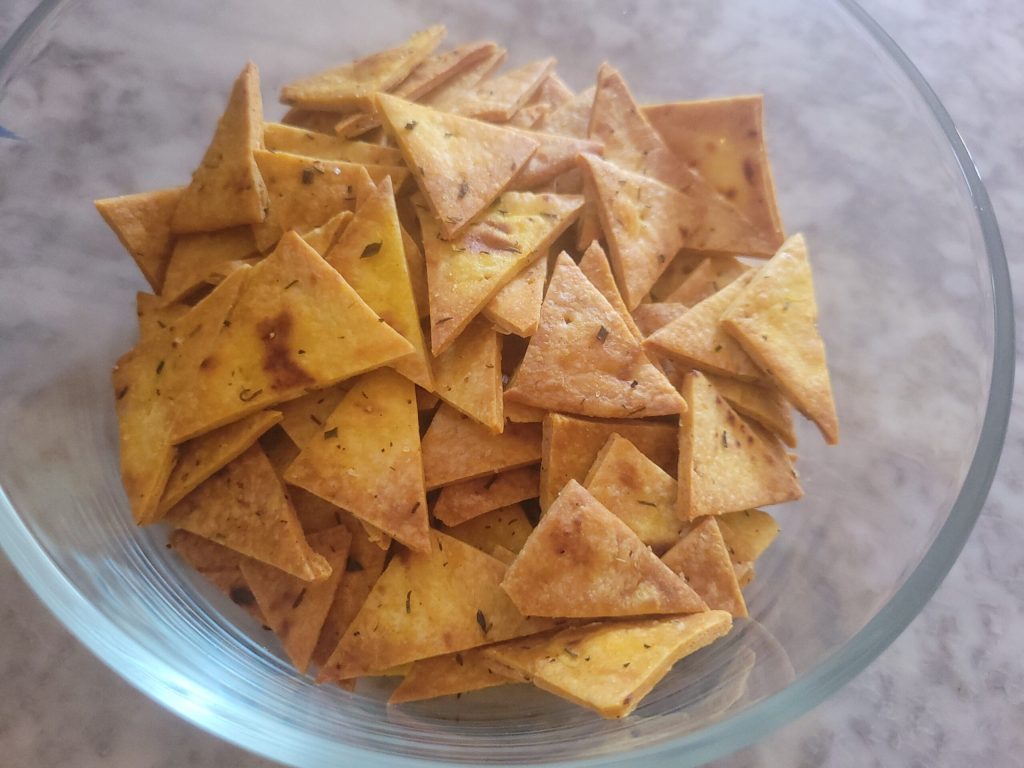Après les avoir découpés, je les ai insérés directement sur la grille et j’ai réglé à 200° pendant 5 minutes, il n’était pas nécessaire de retourner les triangles avec la mienne, mais ajustez-vous toujours avec vos friteuses.