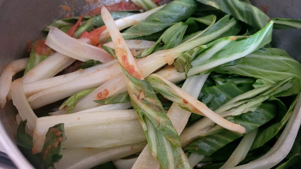 Pendant ce temps, nettoyez et lavez les blettes et coupez-les en lanières, ou en morceaux si vous préférez