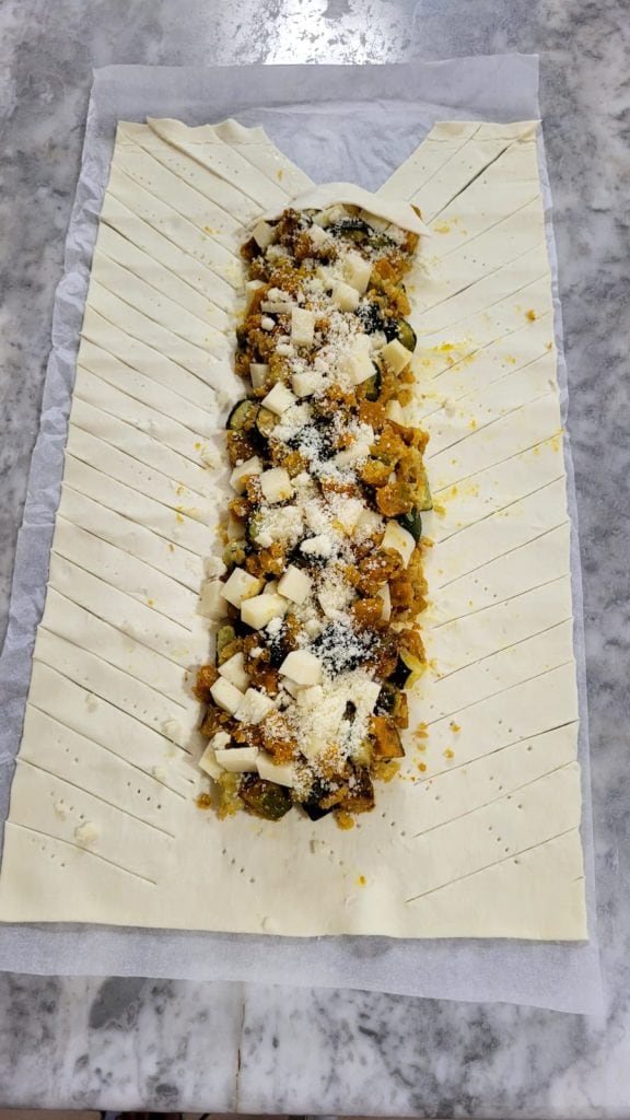 Déroulez la pâte feuilletée, piquez-la avec les dents d’une fourchette et disposez au centre la garniture de citrouille et courgettes. Ajoutez le fromage préalablement coupé en dés et saupoudrez avec le Grana Padano restant (1 cuillère). Avec un couteau, faites des incisions obliques en partant à ras de la garniture. Repliez les extrémités et croisez les bandes. Si vous préférez, vous pouvez le fermer en enroulant la pâte sur elle-même, en scellant bien les bords et en faisant quelques incisions en surface pour laisser échapper la vapeur
