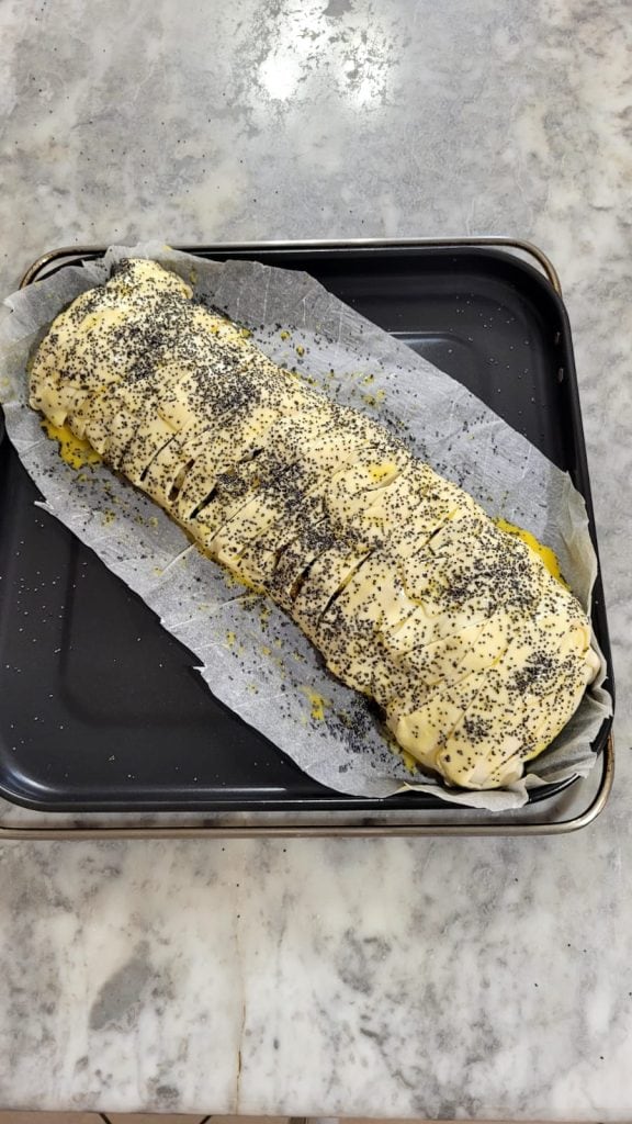 Les graines de pavot peuvent être remplacées par des graines de sésame ou de courge, ou faire un mélange ou les omettre et simplement badigeonner la surface du strudel avec l’œuf battu ou du lait.
