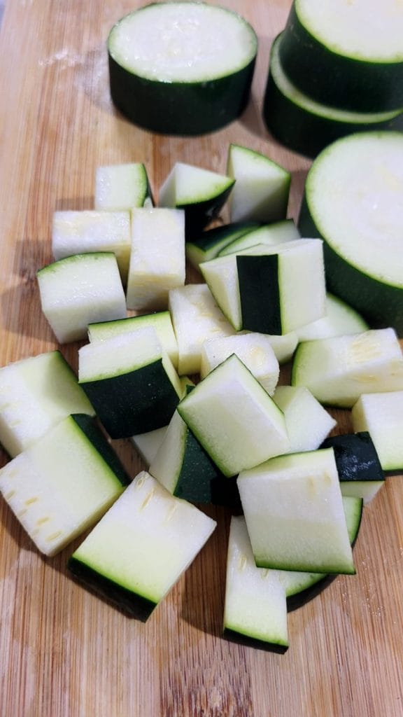 Coupez les courgettes après les avoir lavées et séchées avec un papier absorbant et coupez-les en dés comme vous l’avez fait avec la citrouille