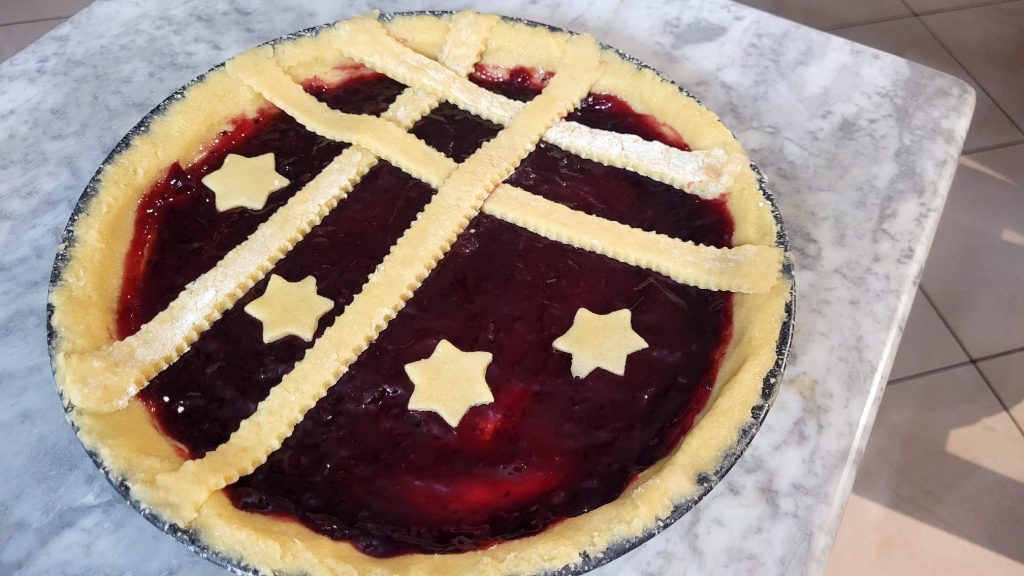 Avec la pâte restante, décorez la tarte, vous pouvez créer les classiques bandes ou les découper après les avoir étalées et les découper de la forme qui vous plaît le plus. J’ai fait quelques bandes et des étoiles