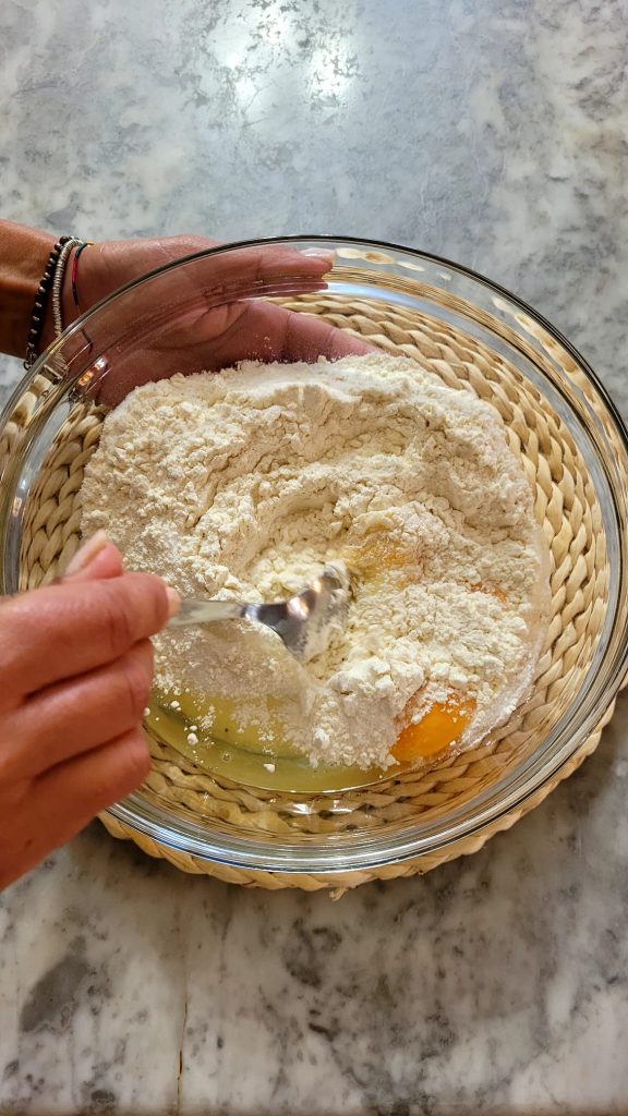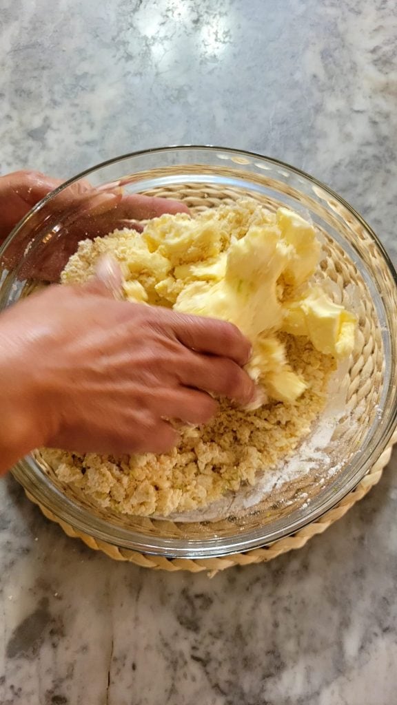 • Dans un bol, travaillez avec les mains la farine, les œufs, le sucre et le sel, jusqu’à obtenir une texture sableuse