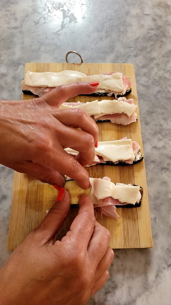 Ajoutez également une bande de tranche de fromage pour chaque tranche. Prenez l’extrémité de la courgette et enroulez-la sur elle-même