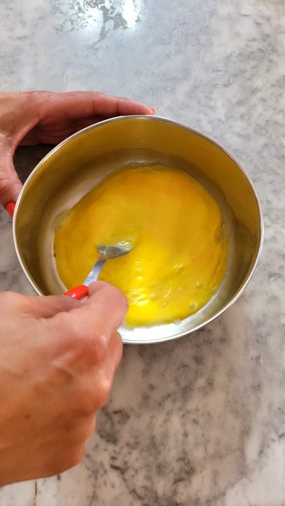 Dans un autre bol, cassez 2 œufs, battez-les avec une fourchette, ajoutez le lait, une pincée de sel, le poivre et la cuillère de Grana râpé. Mélangez bien