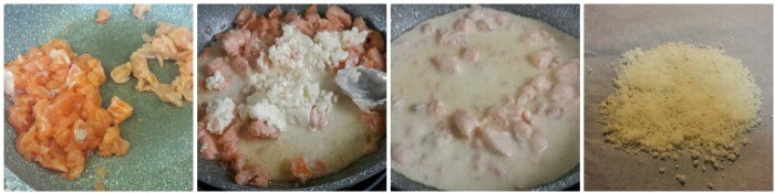 Versez-la dans la poêle avec le saumon, assaisonnez avec de la noix de muscade et une pincée de sel, mélangez bien les ingrédients.