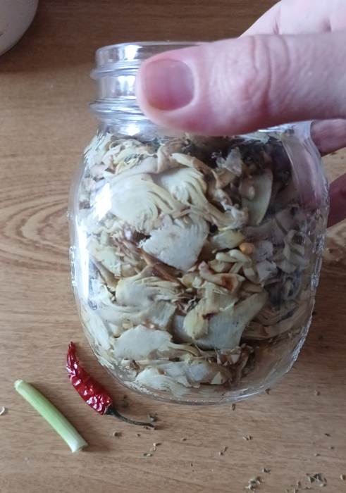 Passé le temps de repos, prenons les bocaux stérilisés et mettons-y un peu d’origan, puis commençons à ajouter les artichauts.