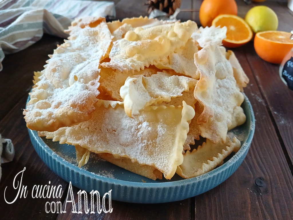 Les chiacchiere sont le dessert par excellence du carnaval, chaque région d’Italie a sa propre recette traditionnelle, plus épaisses, plus croquantes, plus fines et un nom différent pour les appeler, en Toscane nous avons les Cenci de carnaval toscans, de légères feuilles de pâte très sèches, croquantes, légères et pleines de bulles, le vin santo leur donne un parfum et une saveur unique en plus de les rendre très gourmandes, un de ces desserts à essayer.