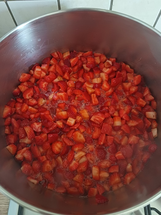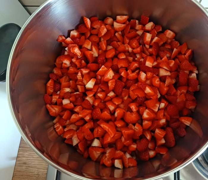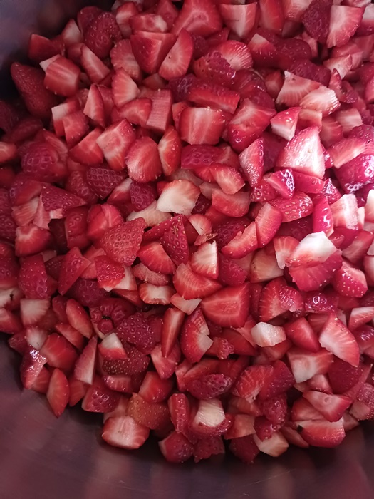 Une fois les fraises pesées, elles doivent être coupées en dés, si possible de la même taille.