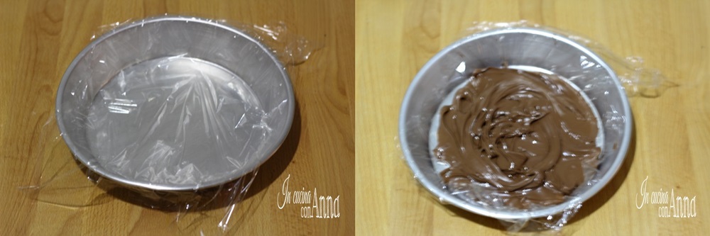 Prenez un moule de 24 cm pour tarte (ou un moule démontable identique à celui que vous utiliserez pour préparer la tarte) recouvrez-le de film plastique pour aliments, faites fondre le Nutella quelques secondes au micro-ondes (si elle est déjà molle, ce n’est pas nécessaire) et versez-la dans le moule, en l’étalant avec une spatule en une couche homogène en laissant un demi-centimètre des bords, mettez au congélateur (photo) jusqu’au moment de l’utiliser pour la recette.