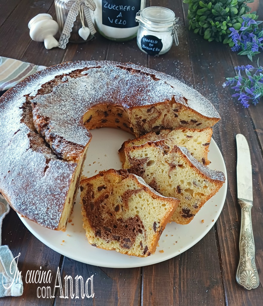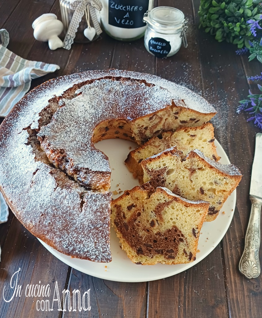 À ce moment-là, versez la pâte au cacao sur celle blanche, et avec un bâtonnet pour brochette ou une fourchette, dessinez des tourbillons pour marbrer les deux pâtes.