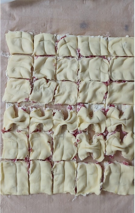 • À l’aide des manches de deux fourchettes ou cuillères, pincez le centre du petit carré en tirant les bords vers le centre et pressez légèrement pour obtenir des nœuds comme sur la photo (la vidéo ci-dessus l’explique mieux : c’est plus simple à faire qu’à décrire).