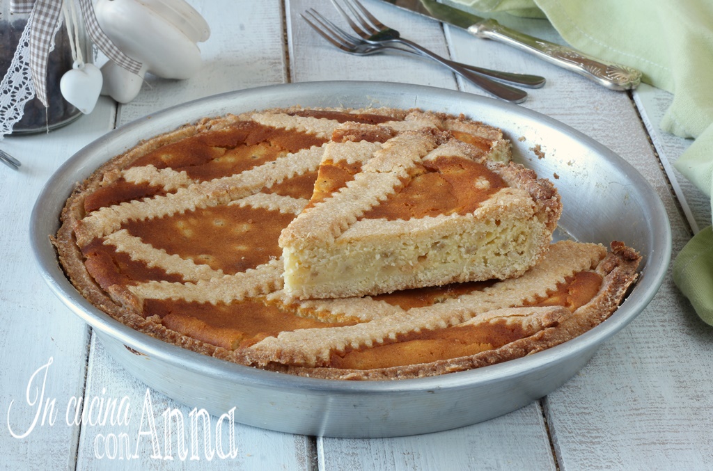 Et me voilà, assez de bavardages et de souvenirs… aujourd’hui je vous présente la pastiera de blé avec crème pâtissière, une version encore plus crémeuse et gourmande de la pastiera de blé; un dessert à l’arôme et au goût inimitables qui avec sa bonté conquérra tout le monde dès la première bouchée.